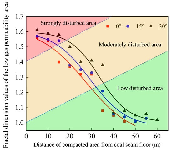 - As the dip angle of the rock strata increases (0° < 15° < 30°), so does the fractal dimension of the low-gas permeability area. Periodic pressure causes the fractal dimension to gradually decrease until it stabilizes at 1.24, 1.27, and 1.34. Additionally, the fractal dimension of the low-gas permeability area is smaller on the working face side than on the side of the open-off cut. The gradient evolution rule suggests that the area of low gas permeability can be further classified into three zones: the strongly disturbed, the moderately disturbed, and the low disturbed areas.