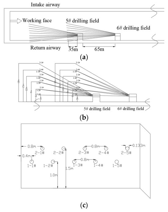 The parameters of the 5# and 6# drilling fields in Hesun Tianchi Coal Mine are adjusted based on the fractal dimension control model of the low-gas permeability area, as shown in Equations (7)–(10). It was noticed that each drilling field has 10 drill holes, which are evenly arranged in two rows. Firstly, the first holes in the upper and lower rows are located 0.8 m and 0.4 m away from the edge of the drilling field, respectively. The spacing between each of the two rows was 0.8 m, as presented in Figure 12. Secondly, the arrangement parameters of the two rows of boreholes are described in Table 6 and Figure 12. Finally, the two drilling fields are separated by 65 m, with an overlap of 35 m.