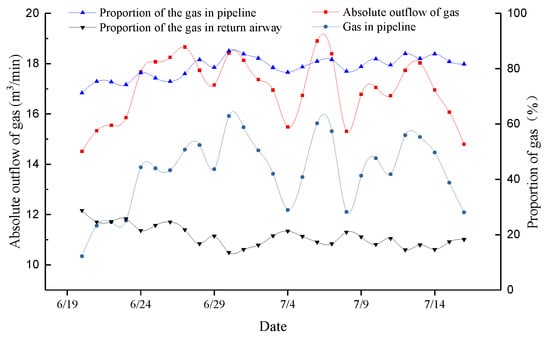 The analysis of the effect of a high-level drilling field on reducing gas concentration was performed based on the 5# drilling field. Firstly, gas extraction work started when the working face advanced to the effective extraction range of the 5# drilling field. Secondly, the 6# drilling field also began to extract gas after 10 days. The compositions of the gas extracted from the high-level boreholes and return airway were monitored, and the result indicated that the ratios of the amount of gas discharged from the ventilation and the amount of gas extracted from the high-level boreholes to the absolute outflow of gas can be obtained, as presented in Figure 10. As shown in Figure 13, the gas extraction from the high-level borehole accounts for 71.2–85.5% of the absolute outflow of gas, with an average of 80.5%, whereas the gas discharged by the ventilation is observed between 14.5% and 28.8%.