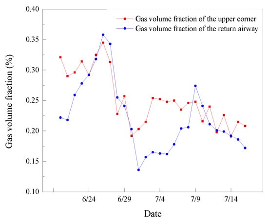 The practical effect of gas extraction in the high-level drilling field has been analyzed. Under the influence of the high-level drilling field, the gas volume fractions of the two areas can be obtained based on the real-time monitoring of gas contents in the upper corner and return airway, as presented in Figure 14. It was noticed from the results that the gas volume fractions of the two areas are 0.35% and 0.36%. Hence, the safety of the working face was effectively ensured, provided that the observation was less than the upper limit of 1% of the gas volume fraction.