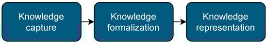 The most relevant terms for this publication will be clarified in the following text, since there is no uniform terminology. In general, design automation (DA) can be understood as computer-aided engineering support. It translates information and knowledge into solutions, tools or systems to support the progress of design processes through automation []. Since electric motor development involves different engineering domains, it is reasonable to extend the concept to multidisciplinary design automation as suggested by []. Another term that is often used in the context of DA is knowledge-based engineering (KBE). Van der Velden differs between KBE and DA and describes the former as a capture of engineering knowledge to emulate human decision making and automate engineering processes. Design automation is described as an automation of sequential steps in engineering processes. These are often only applicable to specific use cases, since they contain hard-coded rules and knowledge []. In more recent definitions, KBE has been described as a method within the context of DA []. These definitions emphasize that KBE leverages existing knowledge to automate repetitive tasks in product development [,]. As shown in Figure 2, three steps are necessary for the creation of a KBE system: knowledge capture, knowledge formalization and knowledge representation [].