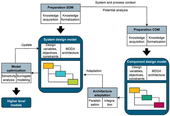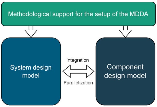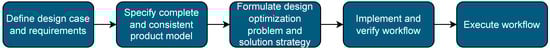 Generative design and engineering is a term that is often used synonymously to DA. It describes methods and processes for generating a large number of solution variants, often related to geometries. This enables engineers to explore the existing solution space more thoroughly. There are different approaches to generative design, ranging from parameterized computer-aided design (CAD) templates [] to leveraging deep networks to synthesize new designs []. The term computer-based design synthesis (CDS) is used in a similar context. It refers to tools and methods in the design process that support engineers to create design alternatives based on computationally encoded knowledge [,]. Another relevant term in the context of automated multidisciplinary design is multidisciplinary design optimization (MDO). The concept of MDO emerged primarily from the challenges encountered in aircraft design, which inherently involves intricate design and simulation processes due to its multidisciplinary nature. MDO addresses these challenges by executing coupled simulations and concurrent optimization of specified design variables []. In recent years, MDO methodologies have been applied to the design of electric motors [,]. Since MDO facilitates the automatic synthesis of geometries while considering multiple domains of analyses, it can be regarded as a distinct form of MDDA that leverages optimization algorithms as a reasoning approach. A typical process for setting up a MDO consists of five steps, as visualized in Figure 3 [].