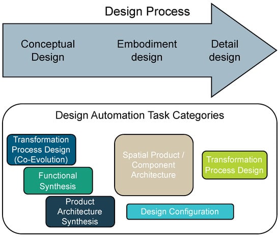 Design automation tasks serve different purposes in the design process. In his categorization—see Figure 4—Rigger groups DA task categories along the design process. Some of them contain multiple tasks, resulting in a total of 15 different design automation task categories. In early design stages, design automation tasks are focused on automatically decomposing the functional structure, i.e., functional synthesis, and on product architecture synthesis. This includes topology and parameter synthesis and analysis. However, at this early stage, the design takes place on a high level and does not yet include concrete geometric features and parameters. In embodiment design, tasks revolve around spatial synthesis and analysis and are grouped under the term spatial product/component architecture. These range from topology and parameter synthesis to analysis preparation, integration and simulation. A spatial topology optimization forms an integrated loop of these tasks. Typical MDO processes are an example of this. Automated design configuration can be applied both in embodiment design and detailed design. Tasks grouped under the term transformation process design focus on the planning of production processes in later stages of the design process. However, a co-evolution of products and processes can be implemented in early stages too [].