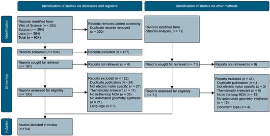 To ensure completeness of papers for a systematic review, the authors searched for relevant publications in a two-stage process, as depicted in the PRISMA diagram in Figure 5. In the first stage, the search was based on a search string, using the search databases lens.org, Web of Science and Scopus. These offer a large database and are able to handle complex search strings. In an iterative process, the search string was specified, considering three parts and their multiple synonyms: design automation, multidisciplinary, and electric motor. The finally used search string is given in Appendix A. The search was conducted within title, abstract and keywords of the publications. In the next steps, doublets were removed, inclusion/exclusion criteria were applied, and the database was extended by a forward and backward citation analysis. In Figure 5, the different steps of the literature identification and selection process following the PRISMA flow diagram [] are illustrated.