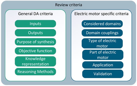 To systematically analyze the papers and answer the research questions, twelve criteria were defined for the review; see Figure 6. Half of these criteria are based on [] and extended by specific criteria relevant for design automation in electric motor development. For the definition of basic DA tasks, Rigger analyzed publications regarding inputs, outputs, goals and DA Methods. The analysis of goals is further split up in purpose, system level and requirements/constraints, while DA Methods consist of knowledge representation and reasoning methods. Since the review at hand focuses on MDDA for electric motors the following criteria were added for the review: considered domains, couplings between domains, machine type, part of the machine, and application. Considered domains were analyzed based on [], couplings were introduced based on the classification in [], and reasoning methods were adapted for electric motor specific reasoning methods defined in [].