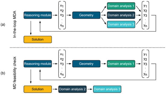 Difference between in-the-loop multi-disciplinary analysis (MDA) (a), where multidisciplinary aspects are considered in decision making and multi-disciplinary (MD) feasibility check (b), where a primary discipline is used for decision making, and other domain analyses are conducted to ensure the design’s feasibility afterwards.