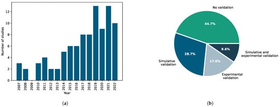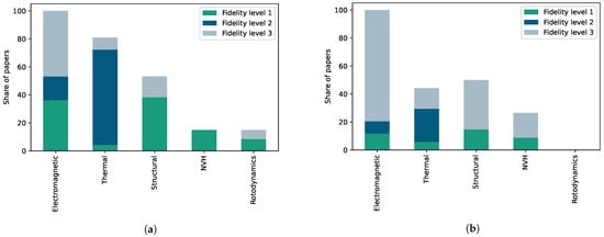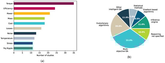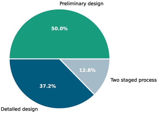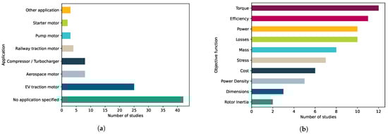 To define the process stage in which the MDDA is applied, the specific design variables were analyzed. Allocation of design variables to process stages of electric motor development is defined based on common guidelines, e.g., [,]. In both procedures, the first step is to determine the main machine dimensions, namely the air gap diameter and the active stack length. In order to determine the stage of the development process, this review evaluates whether the main machine dimensions were already fixed or considered as design variables in the MDDA. The former was defined as detailed design and the latter as preliminary design. Some papers describe a two-stage design process, where a preliminary design is found in the first stage and further elaborated upon. These papers were marked as preliminary and detailed design in the study.