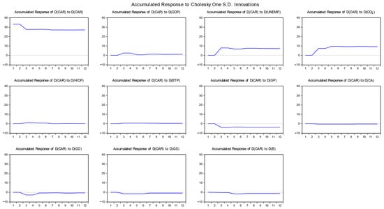 Testing the Johansen cointegration on the six ranks of the restricted variable CAR calls for five cointegrated relations (Table 4). The VAR allows us to examine the interrelationships and dynamic interactions among the variables under study. By applying the VAR model to our dataset, we can present the results of this analysis and gain insights into the relationships between the variables. The VAR model provides a comprehensive framework to assess how changes in one variable impact the others over time.