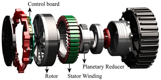 Thanks to its high transparency and high torque density, the compact, light, and thin drive unit is widely used in robot joints. It is composed of multiple pole-pair numbers and high torque density outer rotor motor [] embedded in a planetary gearbox with low reduction ratio, which is also called a proprioceptive actuator [], as shown in Figure 1. The highly integrated structure and multiple pole-pair numbers make the motor small in size but large in output torque. The planetary reduction gearbox with high reverse drive capability is used, which has the characteristics of high transparency and minimal nonlinear error, so that it can directly estimate the torque through the q-axis current []. It can realize high-precision force control without using an expensive torque sensor [], saving a lot in costs. Because of its small size, low cost, and high torque density, this special structure has been gradually applied to multiple applications, such as mechanical arms, exoskeletons, automated guided vehicles (AGVs), and so on.