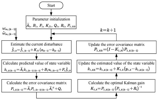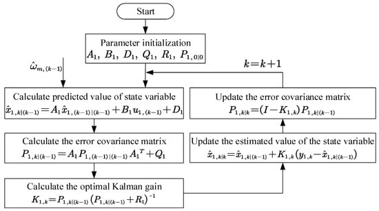 From (23), the optimized state space model is independent on the motor parameters. This is because some items related to the motor parameters are replaced by disturbance items, which reduces the sensitivity of the model to the motor parameters. This means that the improved state space model solves the model mismatch problem caused by the parameter disturbance and improves the robustness of the observer. The flow of the improved current observer based on the Kalman filter is shown in Figure 4.