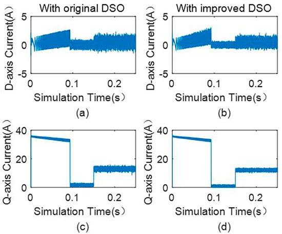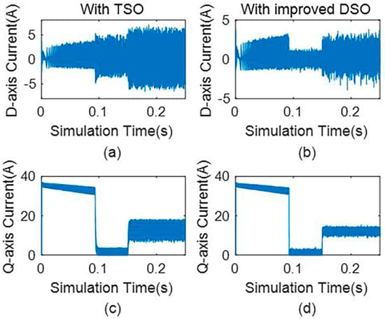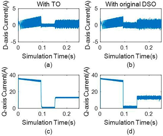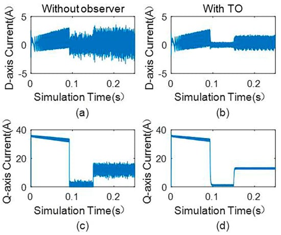 (a) D−axis current without observer, (b) d−axis current with the third-order observer, (c) q−axis current without observer, and (d) q−axis current with the third-order observer.