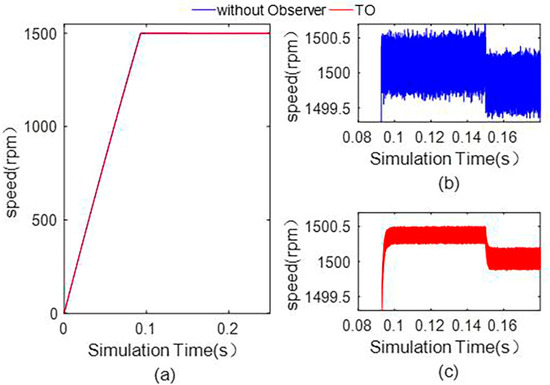 The estimation effect of the designed third-order observer (TO) on the state variables is verified. The comparison of the current of the d-axis and q-axis with the third-order observer and without any observer is shown in Figure 6, and the mechanical angular speed curve is shown in Figure 7. It can be seen from Figure 6 and Figure 7 that the ripple of the d-axis current, q-axis current, and speed are significantly reduced with the third-order observer. The simulation results show that the torque ripple can be effectively reduced when the third-order observer is used.