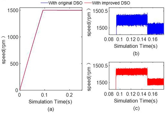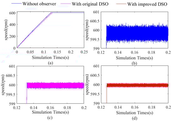 - The estimation accuracy of the speed of the improved DSO is 1499.9780 ± 0.0836 under a 0.25 Nm load, and the ripple of the current iq is 3.87%. The experimental results show that the proposed observer can realize a higher precision estimation of the state variables and can effectively suppress the current and mechanical angular velocity ripple.
