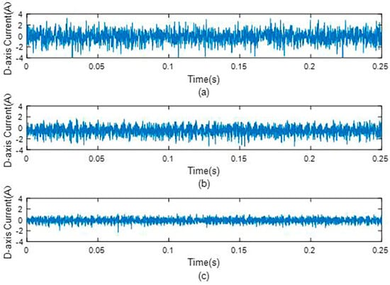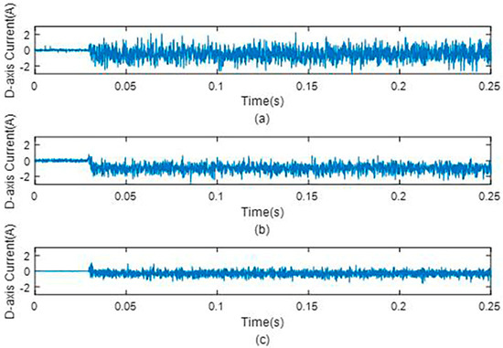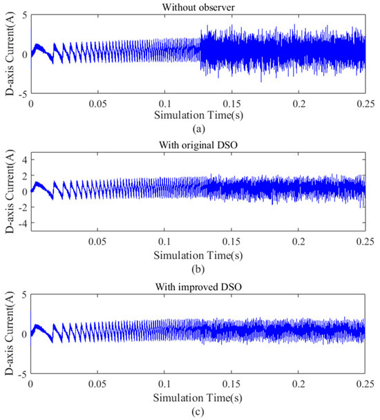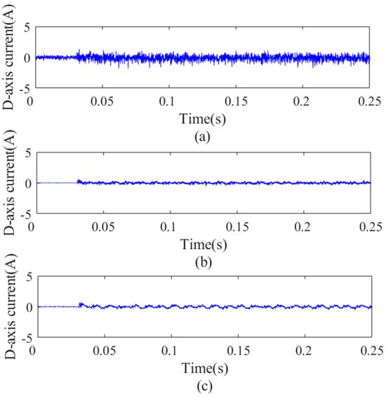 D−axis current under different observers under 0.8 Nm load condition. (a) D−axis current without observer, (b) that with original dual second−order observer, and (c) that with improved dual second−order observer.