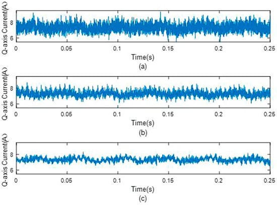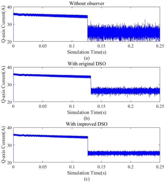 Q−axis current under different observers under 0.8 Nm load condition. (a) Q−axis current without observer, (b) that with the original dual second−order observer, and (c) that with the improved dual second−order observer.