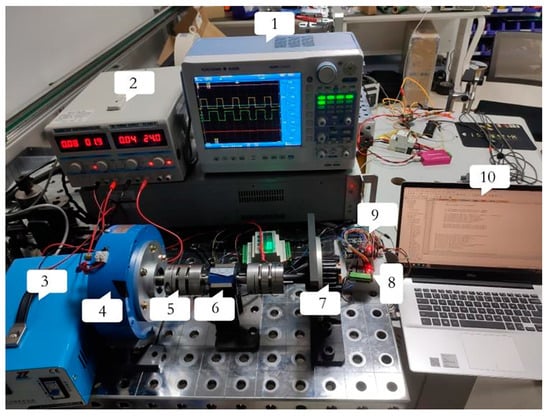 System prototype. (1) Oscillograph, (2) digital power supply, (3) isolated power supply, (4) magnetic powder brake, (5) coupler, (6) dynamic torque sensor, (7) module (including motor, control board and planetary reducer), (8) AD conversion module, (9) data acquisition board, and (10) computer.