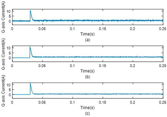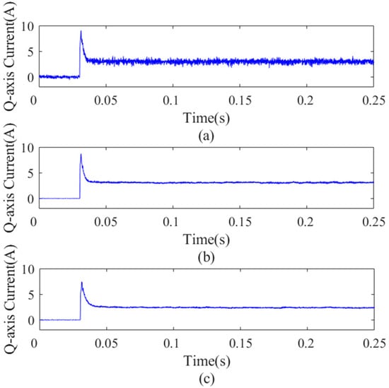 Q−axis current under different observers under no−load condition. (a) Q−axis current without observer, (b) q−axis current with the original dual second−order observer, and (c) q−axis current with the proposed dual second−order observer.