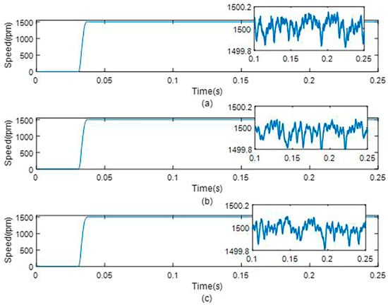 The motor operates at the no-load condition and the given reference mechanical angular speed is 1500 rpm. The experimental results with the different observer strategies are shown in Figure 18, Figure 19 and Figure 20. Figure 18 shows the d-axis current under different observer strategies. Figure 19 shows the q-axis current under different observer strategies, and Figure 20 shows the rotor speed response curve under different observer strategies. Table 7 shows the current and speed estimation accuracy with different observer strategies under no-load conditions.