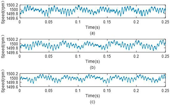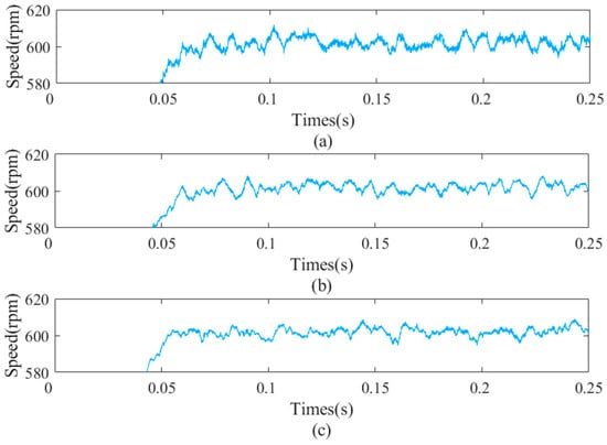 Mechanical angular speed with different observers under 0.25 Nm load condition. (a) Angular speed without observer, (b) that with the original dual second−order observer, and (c) that with the improved dual second−order observer.