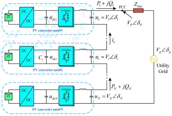 The structure of the single-phase two-stage PV inverters grid-connected system is shown in Figure 1, where N PV inverter units are series-connected. The DC pre-stage of each unit is composed of an independent PV array and a DC/DC converter, which is used to boost the PV voltage and realize MPPT control; the AC post-stage is composed of an H-Bridge inverter module and a LC filter. These PV inverters are expected to transmit their maximum active power to the power grid.