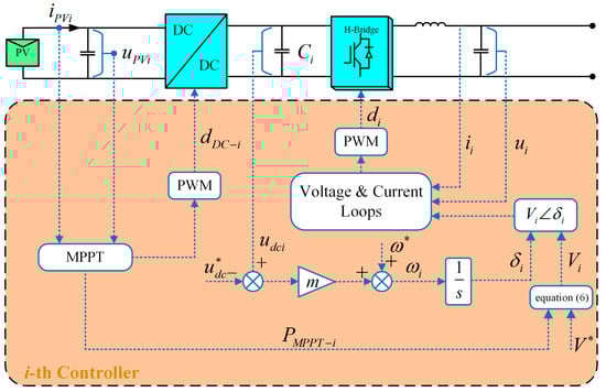 The control block diagram of the i-th unit in the series-connected PV inverters is shown in Figure 2. The output voltage and output current of the PV array are sampled, and the driving pulse signal of the DC/DC converter is obtained according to the MPPT algorithm and PWM modulation, to realize the real-time MPPT of the PV array. Meanwhile, the voltage on the DC side of the inverter, , is sampled, and through the proposed decentralized control strategy, the output voltage reference is generated while is stabilized. Also, the output voltage and current are sampled, then the driving pulse signal of the H-Bridge inverter is obtained through voltage and current dual closed-loop control and PWM modulation, to make sure that tracks well. Finally, the goal of MPPT, frequency and phase self-synchronization, is achieved.