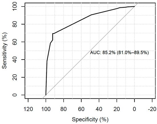The area under the curve in Figure 1 is 85.2%, CI 95% [81.0%, 98.5%]. The values of above 80% are considered to have good discriminating effect.