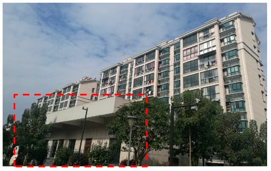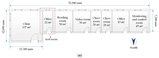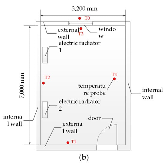 The test room is located in an activity center of a residential community, as shown in Figure 1, in the city of Ningbo, China. The single-story building is oriented along the north–south axis and it is divided into eight rooms, as illustrated in Figure 2a. All rooms are heated during the winter and the office room was used for the radiator heating experiments. The room, with a usable floor area of 22 m2 and an interior height of 2.8 m, having two external walls and a window, was used for the test because its area and utilization time met the test requirements. The building was designed according to the category B buildings of “Design standard for energy efficiency of public buildings” [], and the thermophysical parameters of this room are given in Table 1. As presented in Figure 2b, four K-type thermocouples (T1–T4) were placed in different locations inside the test room to record the indoor air temperature and one (T0) placed outside the room to measure the outdoor air temperature. The relative error of the thermocouples is ±2% of the measured value. The electricity consumption of the radiators was recorded by an ammeter.