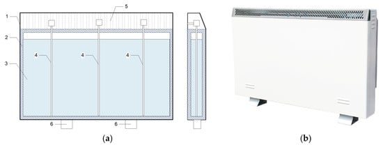 General schematic (1—shell, 2—vessel, 3—PCM, 4—electric heating tubes, 5—grids, 6—base) (a) and external appearance (b) of the electric radiator combined with PCM storage.