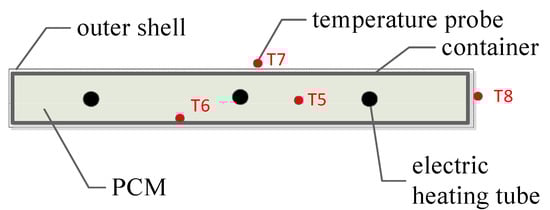 The electric radiator is composed of an outer steel shell with grids, a ceramic container filled with PCM and three electric heating tubes, as presented in Figure 3. The temperature inside the PCM (T5), on the surface of the container (T6), as well as on the front and side surface of the shell (T7) and (T8), were recorded with K-type thermocouples, as illustrated in Figure 4. The relative error of the thermocouples is ±2% of the measured value. The temperature values experimentally obtained were compared with the simulation results to verify the numerical model.