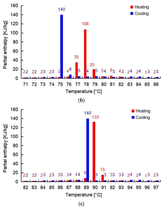 Melting/freezing temperatures and partial enthalpy of PCMI 58 (a), PCMI 78 (b) and PCMI 90 (c).