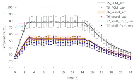 Comparison of the numerical prediction and experimental temperature of PCM (T5), vessel (T6) and shell front surface (T7) with error bar of ±10%.