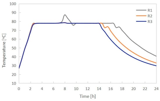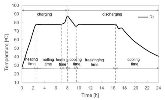 The temperature of PCMI 78 incorporated into the radiators R1, R2 and R3 during the charging and discharging process.