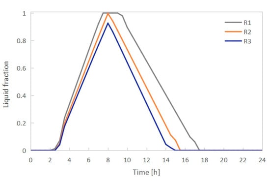 The liquid fraction of PCMI 78 incorporated into the radiators R1, R2 and R3 during the charging and discharging process.