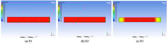 The mass of PCMI 78 used in the electric radiator was determined to be 96 kg, according to the above-mentioned calculation. For a given volume of PCM, the radiator configuration has an important influence on its thermal performance. In this section, the effect of the length–width ratio (L/B) of the radiator cross-section was studied when keeping the height unchanged. Table 5 shows the three different radiator configurations R1, R2 and R3, with an increasing L/B ratio and a decreasing characteristic size l for determining the convective coefficient of the shell outer walls, according to Equation (20).