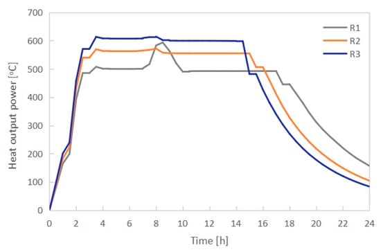 The heat output of the electric radiators R1, R2 and R3 during the charging and discharging process.