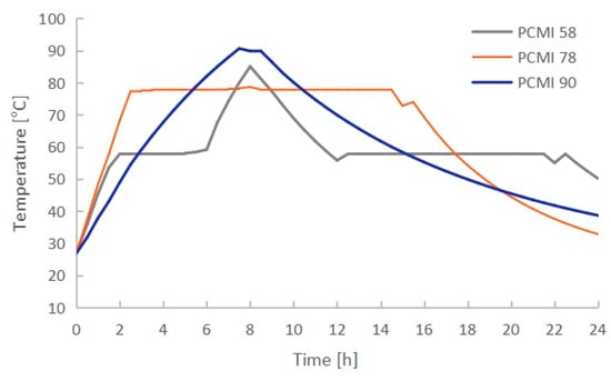 The PCM used for electric radiators should have a melting temperature between 55 °C and 100 °C. Paraffin, fatty acids and salt hydrates could be suitable for this application. However, paraffins and fatty acids are usually more expensive than salt hydrates. The low cost and easy availability of salt hydrates make them commercially attractive for heat storage applications. Furthermore, salt hydrates have a sharp melting point to maximize the efficiency of a heat storage system and a high heat of fusion to decrease the required size of the storage system []. Therefore, three commercial salt hydrates were selected for the study, namely PCMI 58, PCMI 78 and PCMI 90, provided by Lidy Energy Technology Co., Ltd. (Ningbo, China) []. Table 2 presents their specific heat, thermal conductivity and density, as well as their melting temperature and enthalpy, which were determined with a three-layer calorimeter developed by the company w&a wärme-und anwendungstechnische Prüfungen in Germany [], as illustrated in Figure 5.