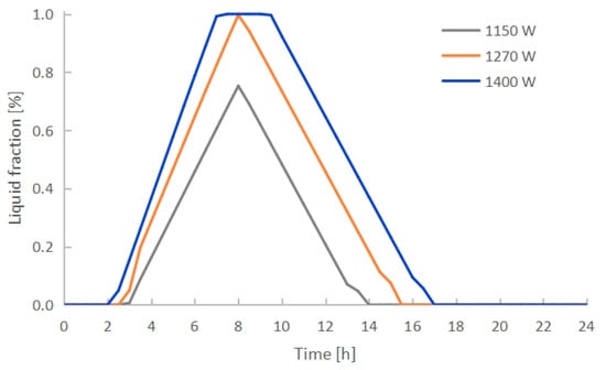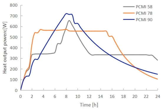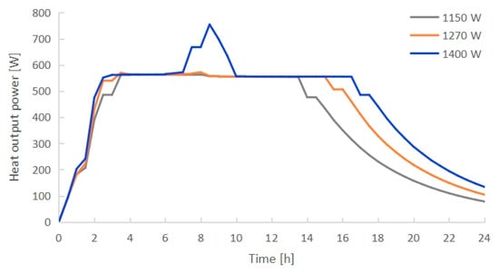 - The PCM melting time decreased with increasing electric heating power. PCMI 78 was completely melted after exactly 8 h of heating with 1270 W, while only 75.3% of the material was melted with 1150 W, and it was overheated with 1400 W. Conversely, both the heat output and thermal storage efficiency grew with the increasing electric heating power. The average heat output in 24 h arrived 412 W with 1270 W, which could cover the heating demand of a 10 m2 floor area with a total heating load of 400 W.