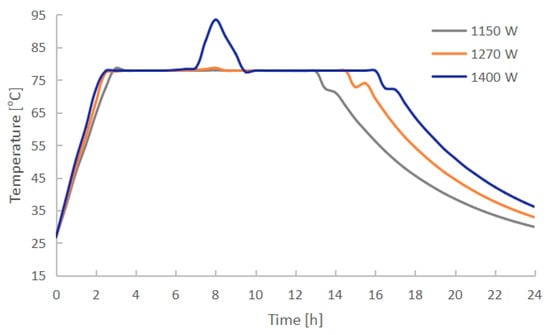 The thermal performance of the electric radiator with a heating power of 1150 W, 1270 W and 1400 W, respectively.