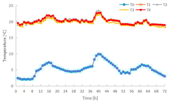 The outdoor air temperature T0 and the indoor air temperatures T1–T4 measured from 6–8 February 2023.