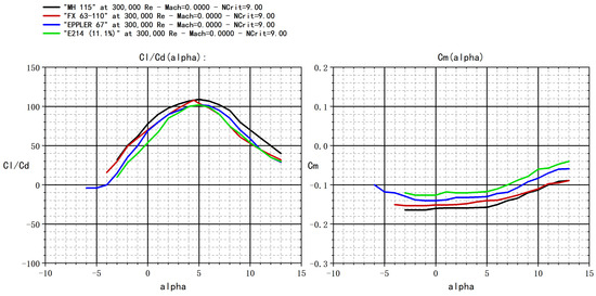 Taking into account the characteristics of low speed and low thrust-to-weight ratio in solar-powered UAVs [31], the selection of airfoils should prioritize low drag coefficients and high lift-to-drag ratios under low Reynolds numbers (300,000). Additionally, factors such as structural design complexity and trim considerations should be taken into account, favoring airfoils with greater thickness and lower moment coefficients [32]. Preliminary screening of airfoils in the Profili airfoil database is conducted within the thickness range of 10% to 14% and camber range of 3% to 8% under a Reynolds number of 300,000 [33]. Among the selected candidates, including MH115, SD-7032-099-88, E214, Eppler67, and FX63-110, a detailed comparison is carried out regarding polar curves, lift-to-drag ratios, drag coefficients, and moment coefficients. Finally, the MH115 airfoil is chosen. Figure 1 depicts the airfoil performance of MH115.