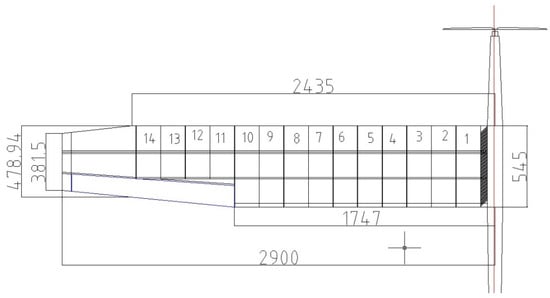 The geometric shape of the wing is depicted in Figure 2. The wing is the primary surface for solar radiation capture, and a flat wing maximizes the surface area exposed to sunlight [34]. An elliptical shape minimizes induced drag, but considering manufacturing complexity, a trapezoidal wing is optimal. To strike a balance between energy and aerodynamic performance, a combination of trapezoidal and flat sections is adopted for the wing’s geometry [35]. The flat section has a span of 1.747 m and a chord length of 0.545 m. The first trapezoidal section has a span of 0.688 m and a taper ratio of 0.48794 m. The second trapezoidal section has a span of 0.465 m and a taper ratio of 0.3815 m. The spar remains straight and is located at 32.29% of the root chord, primarily considering the effects of solar panel installation. The leading edge sweep is 9°, and the trailing edge sweep is 5°. Table 3 presents the geometric parameters of the wing.