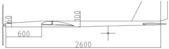 Figure 4 represents a schematic diagram of the fuselage geometry. The fuselage is slender in shape, and to ensure a sufficient tail moment arm, the distance from the rear of the fuselage to the leading edge of the wing is 2 m. Considering construction and transportation conditions, the length of the fuselage is 2.6 m. At the wing junction, the fuselage cross-section measures 0.1 m × 0.1 m, tapering down to 0.06 m × 0.06 m towards the front and rear.
