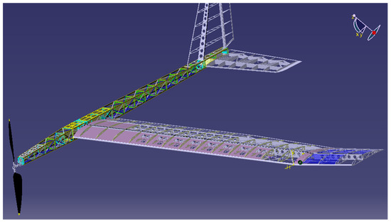 The aerodynamic layout adopts a conventional configuration. The conventional configuration can design satisfactory low-speed performance and is easy to maneuver. It also facilitates the planning of solar panels. The conventional configuration has a simple structure, mature technology, and well-established design methods [27]. The UAV adopts a mid-wing layout. The mid-wing layout helps reduce interference drag, but the main consideration here is that the mid-wing layout is advantageous for connecting the segmented wings with the fuselage, and it also reduces the load transfer path [28]. The UAV’s propulsion system adopts a single-pull configuration. A single engine has advantages such as higher efficiency and lighter weight compared to multiple engines. Placing the engine at the front of the aircraft is beneficial for the balance of the solar-powered UAV. The horizontal stabilizer of the UAV is located at the rear of the fuselage, while the elevator is positioned at the root of the vertical stabilizer. The horizontal and vertical stabilizers have a small angle of sweep, which helps increase the moment arm of the tail and improve the lift curve slope of the tail, thereby enhancing the efficiency of the tail [29]. Additionally, the sweep of the tail surfaces is a common design style. The UAV does not intend to use landing gear, as landing gear would increase drag and structural weight. Solar-powered UAVs do not require frequent short-term takeoffs, so they can take off with the assistance of a launch vehicle. The launch vehicle is not fixed to the aircraft and will automatically detach during the taxi phase. The landing method involves a belly landing.