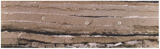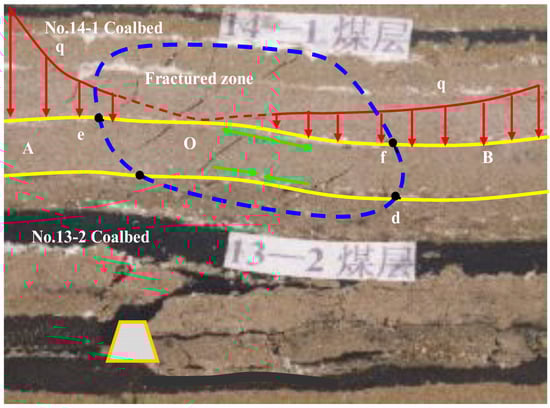The roof of a coalbed group is composed of several coal and rock strata with different properties. After coal mining, the immediate roof will cave when roof suspension reaches a certain limit. As the mining proceeds, relatively hard strata (normally known as key strata [] will cave, which is called the first weighting. With the advance of the panel, key strata cave repeatedly after a certain period, forming periodic weighting in the panel. According to researches on mining subsidence and roof strata control [,,], three zones, i.e., the caving zone, the fracture zone and the bending subsidence zone, exist in the gob overburden. The caving zone experiences a process of caving, reloading and compaction. The fracture zone, also referred to as the separation layer breakage zone, experiences a process of crack generation, crack growth and compaction. Both the caving zone and the fracture zone are characterized by dramatic longitudinal and transverse movements and slips between coal and rock strata, while the bending subsidence zone features the weakest movements and slips. Figure 1 shows the roof rock damage and crack growth characteristics above the returnair entry of the simulated panel []. With Layer AOB as an example, Section AO is in coal and rock strata, while Section OB is at the cantilever position. Layer AOB is subject to an unevenly distributed load q that comes from the overburden and the load around Point O approximates zero. This layer can be seen as a loaded cantilever beam. According to the rock damage characteristics, the layer below Layer AOB (i.e., Section CD) is under compression, while the layer above Layer AOB (i.e., Section EF) is under tension. Resultantly, Layer AOB breaks under the action of shear stress and the rock strata slip laterally. Separation layer breakage occurs when the roof strata cave and deform asynchronously (Figure 2). Specifically, strata below Layer COD cave first and break at Point O where a relatively large separation space emerges [].