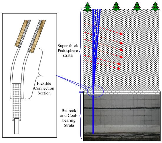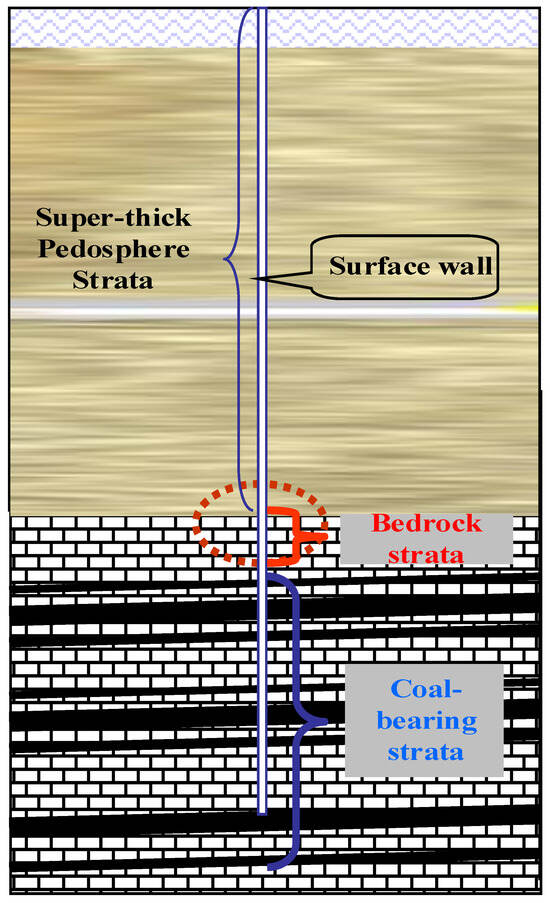 The coalbeds in the Huainan and Huaibei coal fields occur in the form of a coalbed group. The coalbed group, consisting of 8–15 recoverable coalbeds, is buried at a depth of 400–1500 m and covered by pedosphere strata that are 400–600 m thick. From the surface to the recoverable coalbeds, strata fall into three sections, i.e., the pedosphere section, the bedrock section and the coal-bearing strata section (Figure 3). The pedosphere section, which mainly comprises sand, soil and water, has certain liquidity. The well body in this section exhibits strong rigidity because it is wrapped by wet soil and sand. Although the whole well body here moves laterally along with the movement of pedosphere and deviates from the vertical axis, the movement is uniform on the whole. Hence, damage barely occurs in this section. The coal-bearing strata section is mainly composed of coal and rock strata with different levels of hardness. Since this section is greatly influenced by mining and the overburden moves actively, the well body in this section can hardly resist damage movement from the overburden because it is wrapped by rock. Controlled by rock strata, the well body in this section moves along with rock strata or is broken by rock strata under the action of complex mining stress []. Under mining disturbance, the bedrock section moves less intensely than the coal-bearing strata section and its movement is integrated. As a result, the well body in this section is unlikely to be damaged and well completion can be achieved easily.