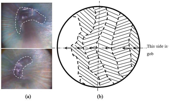Characteristics of shear breakage. (a) Schematic diagram of cross-section shrinkage under shear force. (b) Borehole television logging images for shear breakage.