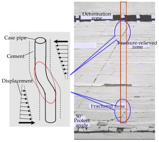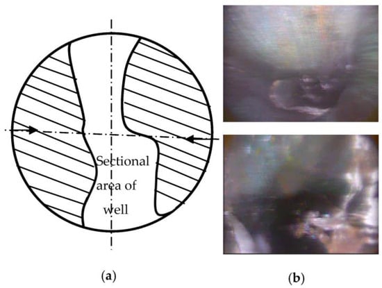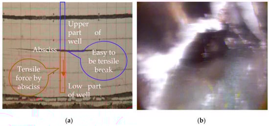 Slip dislocation occurs between the caving zone and the fracture zone. According to onsite television logging images, generally, lower rock strata undergo horizontal slip dislocation first. Afterwards, the well body in two rock strata moves continuously along with slip dislocation of the lower rock strata, generating concentrated shear stress at the junction of the slip dislocation and thereby causing slip-shear breakage to the well body []. Mechanical analysis on shear breakage is shown in Figure 9; the characteristics of shearing breakage are depicted in Figure 10a; and the television logging image recording shear breakage of the well body is provided in Figure 10b.
