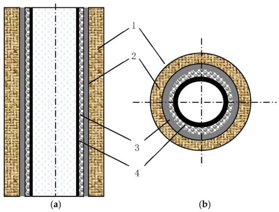 Schematic diagram of double-case pipe composite well body structure. 1—Outside cement, 2—Outside steel pipe, 3—Inside cement, 4—Inside steel pipe. (a) Vertical cross-section view. (b) Horizontal cross-section view.