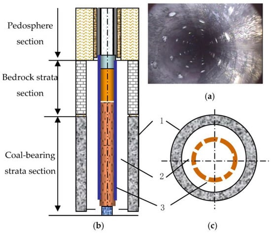 Schematic diagram of “dodge” in the production section. 1—Coal-bearing strata, 2—Expanded hole, 3—Production section with small holes of surface well. (a) Borehole television logging image. (b) Vertical cross-section view. (c) Horizontal cross-section view.