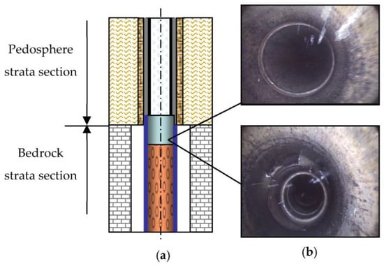 Cementing system of “upper stop”. (a) Vertical cross-section view. (b) Borehole television logging images.